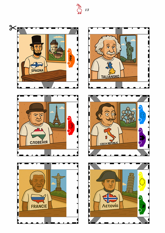 Na každém obrázku je portrét slavné osobnosti z nějaké země, která má na triku obrys jiné země vyplněný vlajkou ještě další země a název čtvrté země jazykem páté země. Za oknem je známá stavba z šesté země. Vedle portrétů jsou autíčka v prvních šesti barvách duhy a na nich ikony pro aspekt, kterým se určuje země (smajlík – osobnost, jazyk – jazyk, Abc – název, domeček – stavba, státní hranice – obrys, vlajka – vlajka). Na okrajích čtverců je symbolická státní hranice, která tvoří morseovku. Přečteme-li v prvním obrázku morseovku intuitivním stylem shora zleva po směru hodinových ručiček (nebo také od nůžek směrem, kterým ukazují), dostaneme mezitajenku SKRZE HRANICE. Na ostatních čtvercích už jsou jen roztříštěné kusy této mezitajenky. V pozadí čtverců jsou šedé znaky, ve kterých je snadné odhalit římské číslice I, V a X.