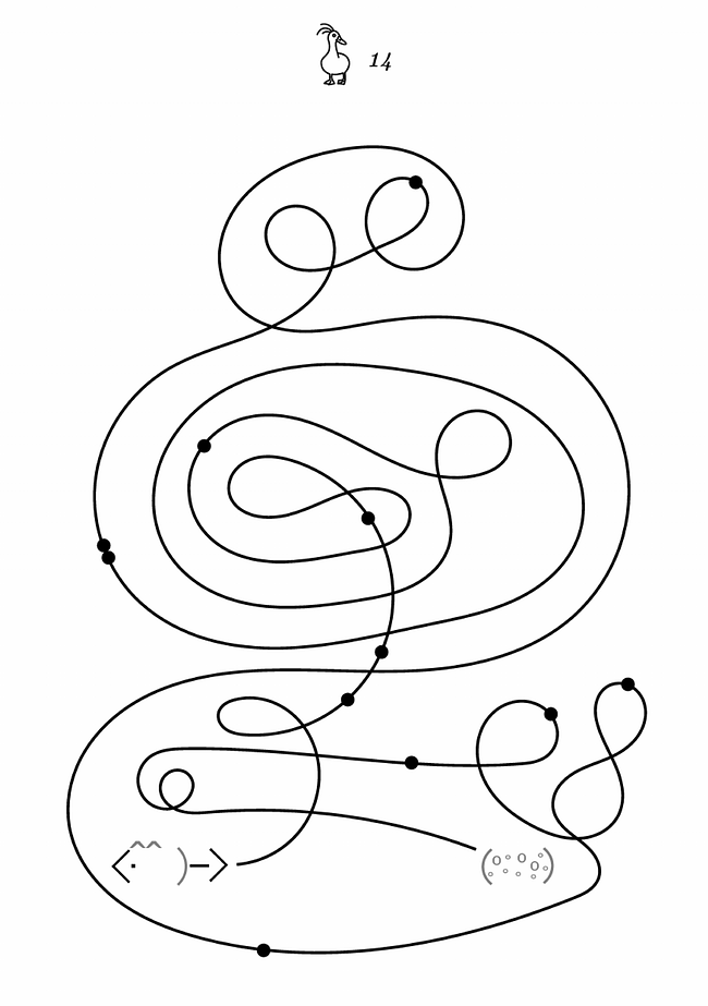 Morseovka. Jdeme od myši k sýru a pokaždé, když nám cestu překříží jiná část cesty myši, poznamenáme si jestli nás kříží zleva doprava nebo zprava doleva, to nám dá tečky a čárky. Kuličky jsou vždy na půl cesty mezi kříženími, dávají nám tím oddělovače.