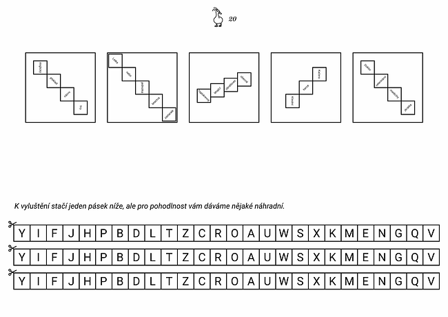 Pět vět v šifře definuje slova DUCK, PERUT, PTAK, JAN a MVDR. Definice odpovědí mají právě tolik slov, kolik má odpověď písmen. Takže každému slovu v definici můžeme přiřadit písmenko z odpovědi. Nyní si vezmeme jednu z odpovědí a přiložený pásek a provede ohyby pásku v místech jednotlivých písmen tak, aby ohyb byl ve stejném směru, jako je definiční slovo přiřazené k danému písmenku. Pásek se nám tak poskládá do tvaru velkého písmene. Postupně tak poskládáme písmenka HESLO. Nyní celý postup na pásku zopakujeme s písmeny HESLO a směry ohybů jsou dané pozicemi malých čtverečků v rámci velkého čtverce. Pásek se nám poskládá do obrysu domečku a to je naše heslo.
