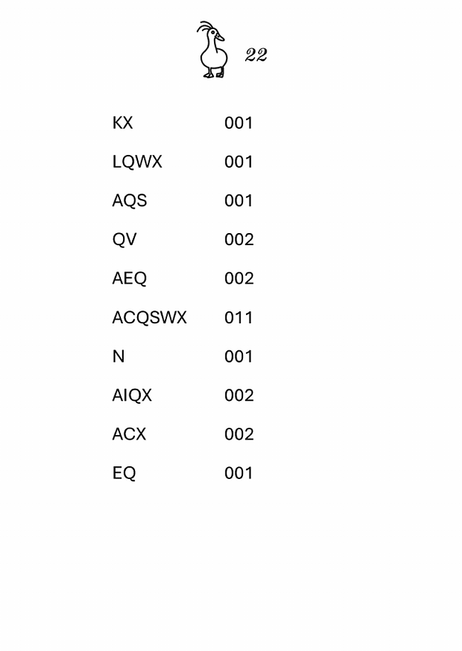 Písmena v rámci shluků jsou seřazena abecedně. Čísla napravo jsou v trojkové soustavě. Čísla vybírají písmeno ze shluku, čímž dostaneme mezitajenku `klávesnice`. Podíváme se, kde leží písmena ze shluků na klávesnici. Můžeme si všimnout, že kromě písmen slova `klávesnice` se ve shlucích vyskytují pouze písmena, která se na klávesnici vyskytují vlevo (vyjímkou je Y/Z, které je kvůli nejasnosti vynecháno). V každém shluku jsou použita vždy nejvýše dvě písmena z každého řádku klávesnice, řádky jsou tři. Kódují trojkovou soustavu.