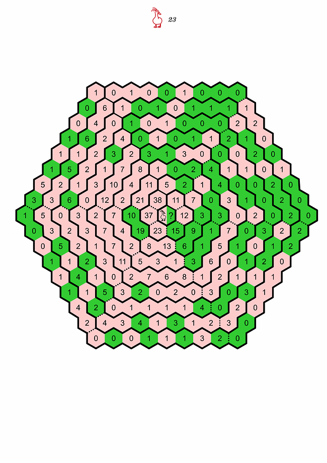 Všimneme si, že spirála od středu postupně přidává 6x 1 buňku, pak 6x 2 buňky, 6x 3 buňky až nakonec 6x 8 buněk. Přitom čísla na určité úrovni buněk se na stejných pozicích zvyšují a nikdy neklesají. Jedná se evidentně o kumulativní posloupnosti. Ve středu je obrázek kachny, jsme na Kachně, slovo KACHNA má 6 písmen, proto se nabízí nápad, že každá posloupnost buněk kumulativně kóduje slovo KACHNA pomocí nějakého šifrovacího principu pomocí 1, 2, 3, až 8 čísel. Nabízí se a potvrzují se tyto principy: 1: pořadí písmene v abecedě, 2: mobil, 3: trinárka, 4: Morseovka, kde 3 je čárka a 1 je tečka, 5: binárka, 6: Braill, 7: sedmisegmentový dispej, 8: semafor. Co znamená červené a zelené podbarvení buněk? Neurčuje třeba shodu tajenky, pokud ji zakódujeme stejným způsobem jako slovo KACHNA? První sektor kódující první písmeno snadno potvrdí, že nápad je správný a první písmeno je jasné B. Pokračujeme dále řešením logické úlohy a postupně odhalíme slovo BALVAN.