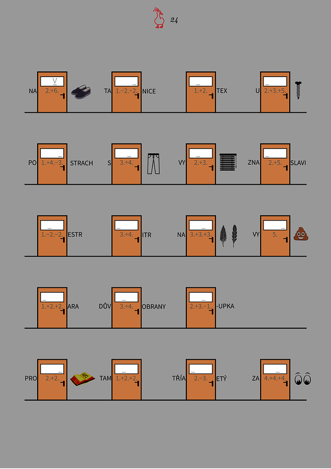 Na každé dveře si domyslíme jeden z obvyklých dveřních nápisů TÁHNOUT/TLAČIT/SEM/TAM/OD SEBE/K SOBĚ/PULL/PUSH tak, aby z písmen a obrázků kolem dveří vniklo smysluplné slovo nebo sousloví. Podle doplněných nápisů a charakteru zadání se nabízí dveře otevřít o 90° a v průhledných okýnkách na místě podtržítek něco uvidět. Nejspíš písmena, protože nad prvním podtržítkem je nadepsáno V.