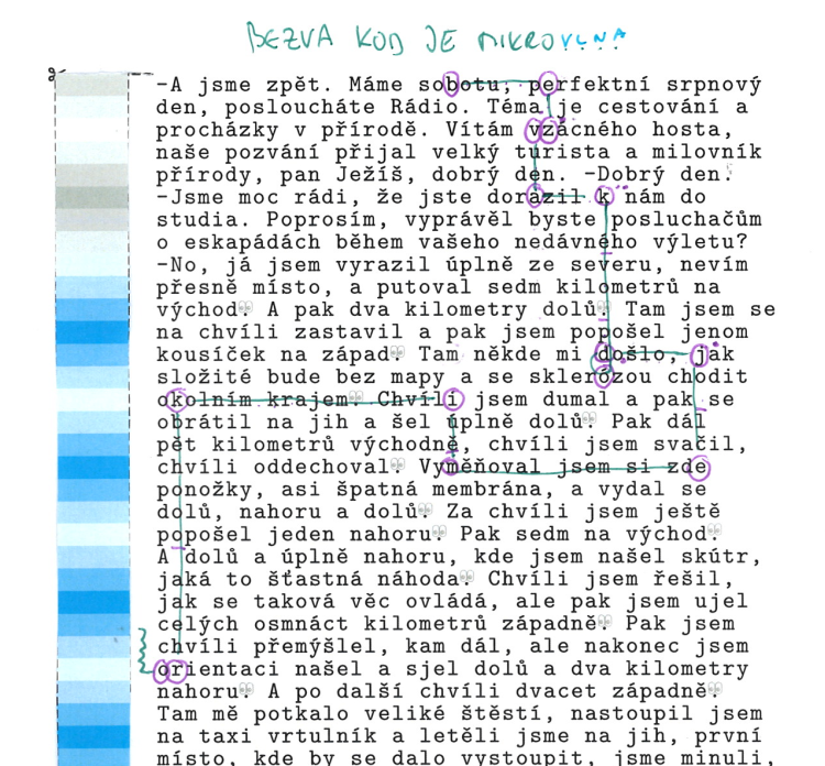 Písmena tajenky čteme kdykoli v popisu cesty narazíme na symbol očíček. Vyjde nám BEZVA KOD ZNI MIKRO????. Tady si uvědomíme, že Ježíše poslední instrukce vyvedou ven z textu přímo do proužku s vlnou. Kód je tedy MIKROVLNA.