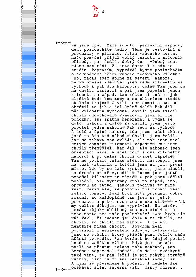 Začneme tedy pohyb na b na úplně prvním řádku (jak říká pan Beránek). Následujeme instrukce, které popisují cestu, přičemž každý kilometr je posun o jeden znak v textu horizontálně nebo vertikálně.